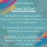 Luminous Creativity Ignited!The holiday magic is officially arriving in Blaine by the Sea! Join the grand opening of "Luminous" at the Blind Bird Art Gallery during The Night Market Luminary Walk